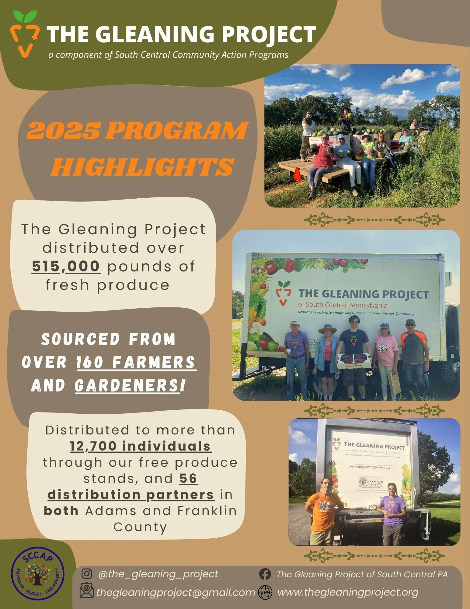 The Gleaning Project is South Central Pennsylvania's collaborative, nonprofit effort to reduce food loss on local farms, and increase food security in our communities. We are part of South Central Community Action Programs (SCCAP).